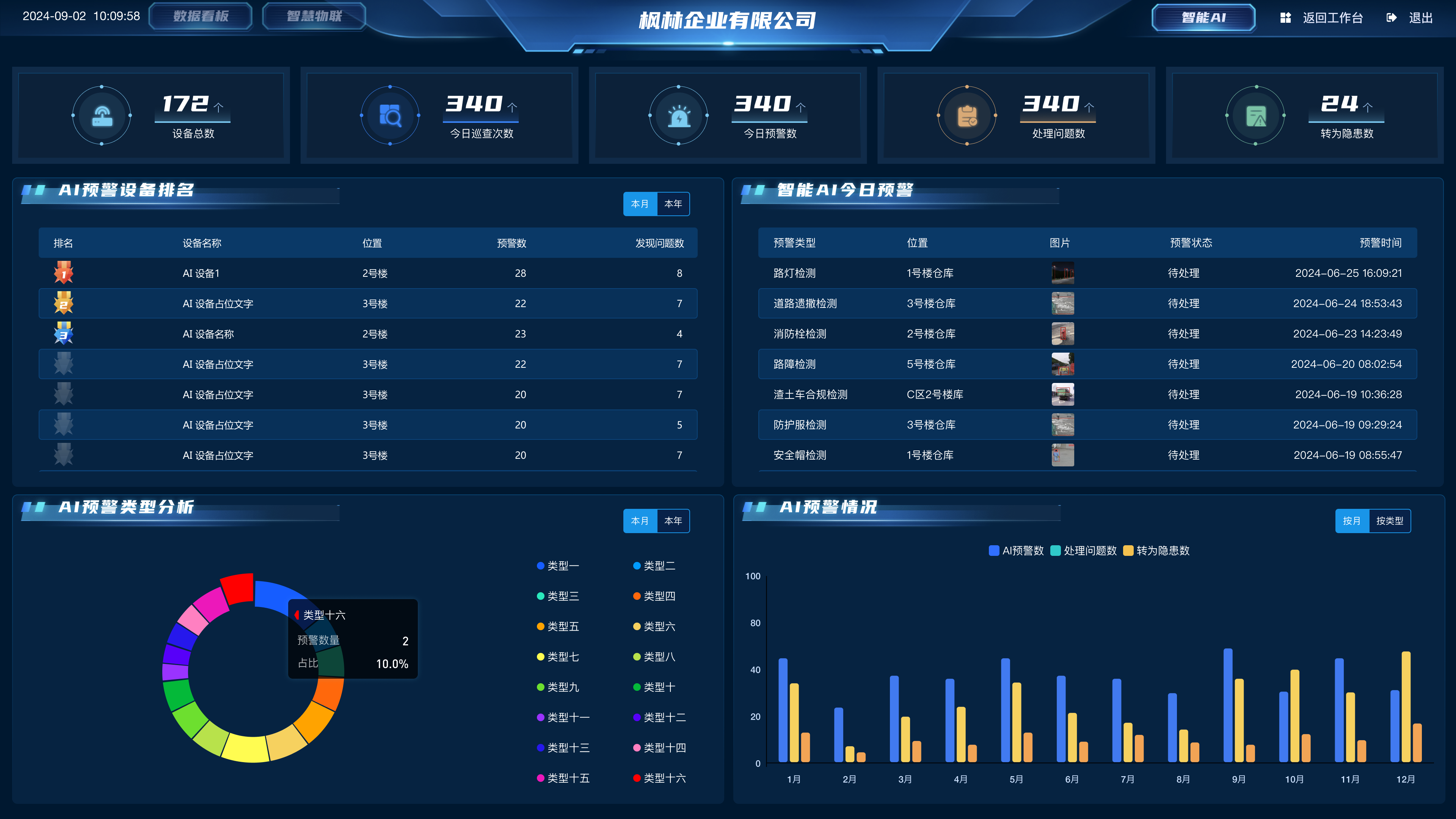 構(gòu)建可視化數(shù)據(jù)中心看板集成匯總企業(yè)安全生產(chǎn)運(yùn)行數(shù)據(jù),涵蓋隱患情況、風(fēng)險(xiǎn)巡查情況、工作完成情況、預(yù)警預(yù)告情況、到期提醒、物聯(lián)報(bào)警等,便于負(fù)責(zé)人全盤掌握企業(yè)安全管理動(dòng)態(tài)。