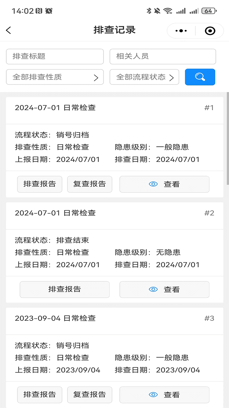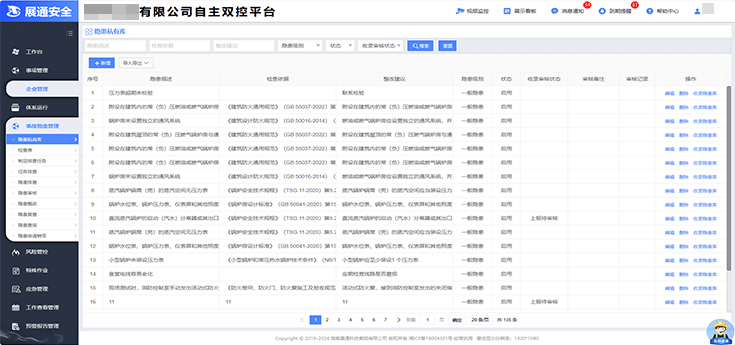 企業(yè)安全管理人員可依托檢查表庫(kù)、隱患數(shù)據(jù)庫(kù)或者自主新增,完成隱患的排查、上報(bào)、整改、復(fù)查、歸檔等一系列流程運(yùn)轉(zhuǎn),實(shí)現(xiàn)隱患閉環(huán)管理;根據(jù)隱患排查治理信息,自動(dòng)生成安全檢查報(bào)告,支持線上打印及一鍵導(dǎo)出。