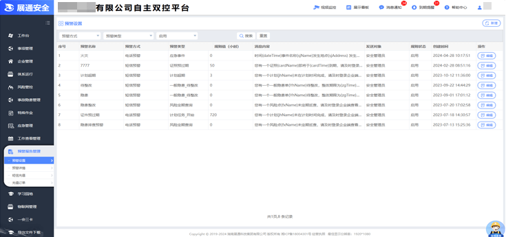 平臺(tái)提供隱患管理超期、證照(預(yù))超期、工作計(jì)劃實(shí)施、風(fēng)險(xiǎn)定期巡檢、物聯(lián)感知、應(yīng)急事件等多方面的預(yù)警,依需設(shè)置預(yù)警規(guī)則,支持短信、電話、微信等多途徑消息推送,實(shí)時(shí)提醒相關(guān)責(zé)任人進(jìn)行處理;