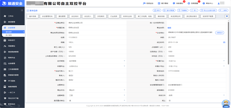系統(tǒng)提供企業(yè)基本信息、安全管理架構(gòu)、安全投入、涉危情況、行業(yè)資質(zhì)、安全培訓(xùn)、職業(yè)衛(wèi)生、涉塵涉爆、有(受)限空間、第三方檢測(cè)、檢驗(yàn)等15個(gè)功能模塊,可根據(jù)企業(yè)實(shí)際情況進(jìn)行選用。